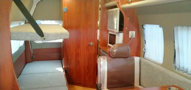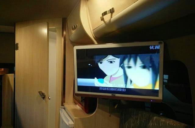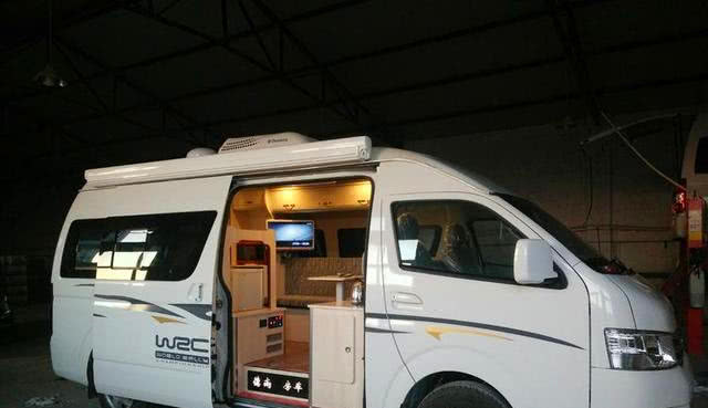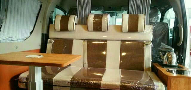 这款车内部的空间实用性很高,中间是三座的沙发和可折叠的餐桌,并且他们在放平之后可以变成一张1.8米乘1.3米的双人床。另外在沙发一侧还有电磁炉和热水壶的配置。车顶两侧是悬挂式的壁橱,还搭载了一台32英寸的液晶电视。紧挨着就是一台微波炉和车载冰箱。