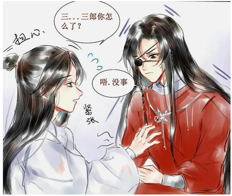 不过吃到一半的时候,花城突然间好像有一点不太对劲,他捂住了胸口,看上去好像是肚子疼一样。谢怜非常担心,就问他三郎你怎么了?花城强颜欢笑说,没事的哥哥。