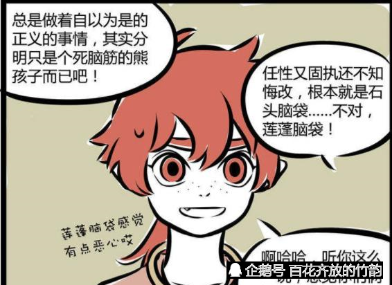 然后龙女继续骂哪吒说他总觉得自己在做正义的事情,但其实只是死脑筋,固执又任性的熊孩子而已。红孩儿哈哈一笑,听到龙女这么一说,觉得他们俩挺像的啊。