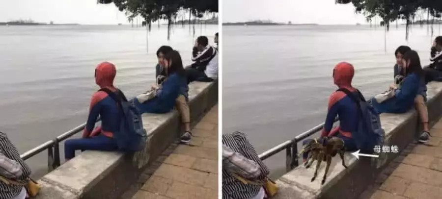 原图就已经很喜庆了,不知道这个小男孩经历了什么,笑的这么开心。后面P上去一头牛真的是毫无违和感啊,放牛回来的牛童啊。这个在蜘蛛侠旁边强行加上一只蜘蛛就算了,还要标注是母蜘蛛,也是真的脑洞清奇啊。