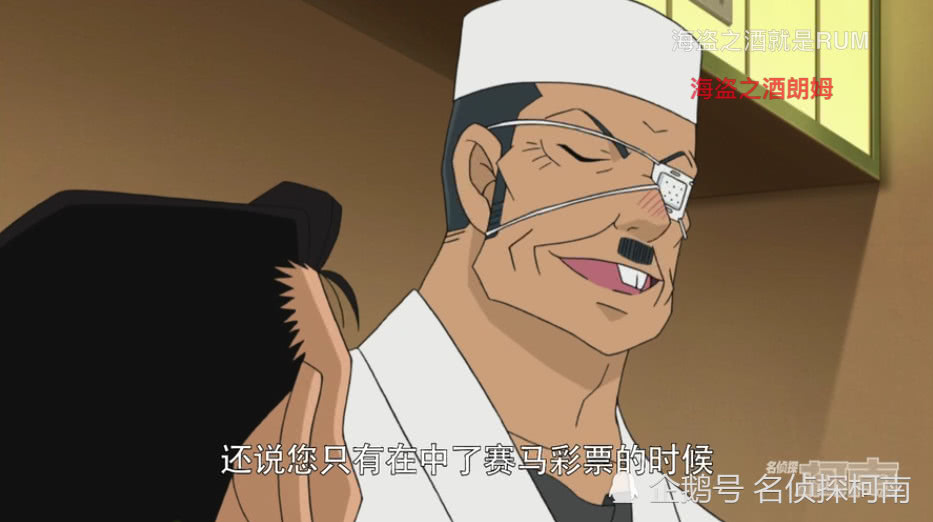 中了100万元的毛利小五郎啊,高兴的合不拢嘴呢。他带着小兰和柯南去寿司店点了三个特等的寿司。那么高调的做事,引起了那个寿司店店员的怀疑。这个店员也很奇葩,很喜欢推理,而且对隔壁的毛利小五郎是非常感兴趣和崇拜。所以没事经常跟店老板聊起过小五郎,所以对小五郎一举一动还是很了解的。毛利小五郎今天点了个特等的寿司,那个独眼店员就猜测小五郎是不是中了今天的万马彩。店员推理说小五郎平时中将了,都会来寿司点点中等的寿司吃吃,今天却点了个特等的,说明是中了大奖。这个店员推理没有错的,因为今天开奖只有万马彩中了奖,其他的全部都没中。