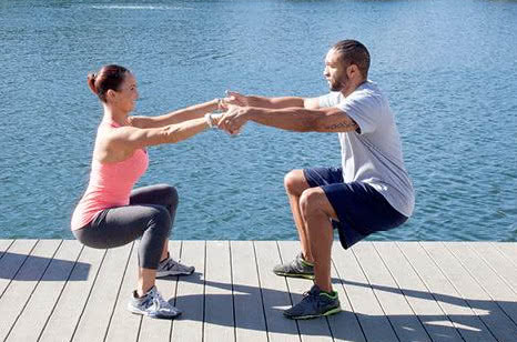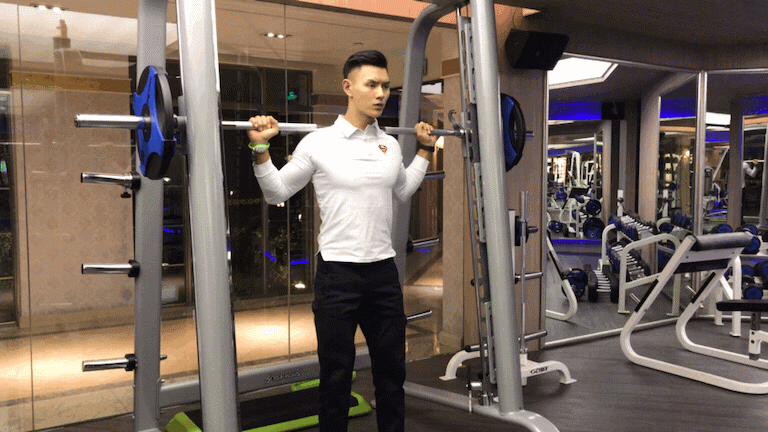动作要点:双腿必须保持与肩同宽的张开距离,头部始终朝向正前方,挺胸收腹背部挺直,身体微微前倾。