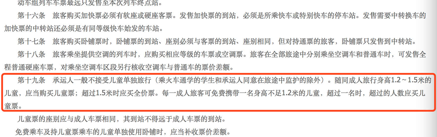 最新修订的《铁路旅客运输办理细则》中规定,随成人出行的,身高在1.2米至1.5米间的儿童应当购买儿童票;超过1.5米时应购买全价票。每一成人旅客可免费携带一名身高不足1.2米的儿童,超过一名时,超过的人数应买儿童票。儿童没有身份证时,还可以在同一订单下再次使用同行成年人的身份信息购买儿童票。
