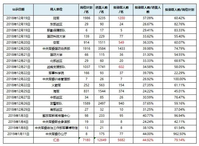 招录比综合反映了2018军队文职的报考难度,同时可以对于2019备考提供数据上的理论参考。