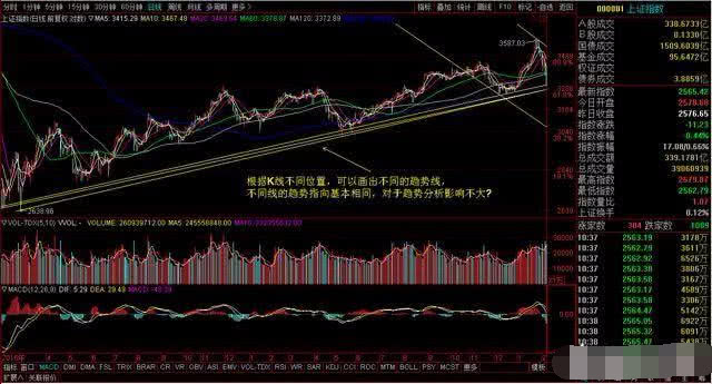实际上纠结于划趋势线是连接K线实体还是影线的意义并不大。因为趋势线并非是真正的未来的趋势线。我们根据K线画出的趋势线可以有N条,而且每条都可以有充足的理由来支持这样画下去。这是因为我们所画的趋势其实是我们脑中的趋势,并未来的真实的趋势。趋势线实际上是对未来趋势的一种假设。但是这条线其实是你自己假设的。K线实体的意义更强,实体是多空最终进驻的地方,开盘价和收盘价,是日内最重要的价格之一,影线更多是盘中进行试探的方向,多空最终并未能成功驻守,实体部分一般才是成交的密集区域,这是我们划线的优先选择点。