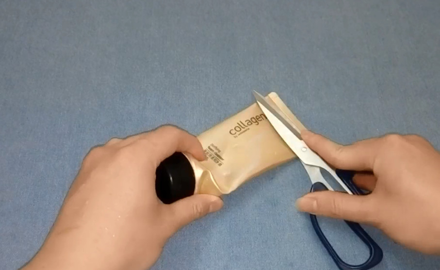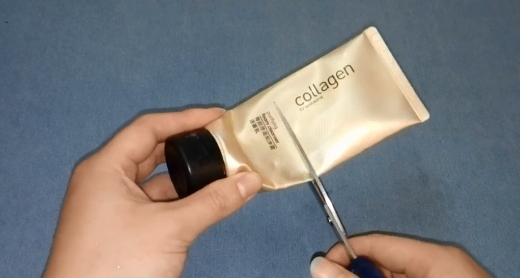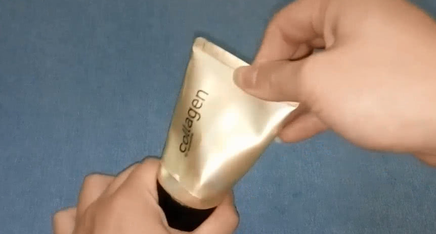 你看,我这只洗脸奶都已经用完了,完全挤不出了,一般都是直接扔掉,可是这样就浪费了,其实我们只需要在这里剪一刀,洗脸奶可以多用一个月呢。