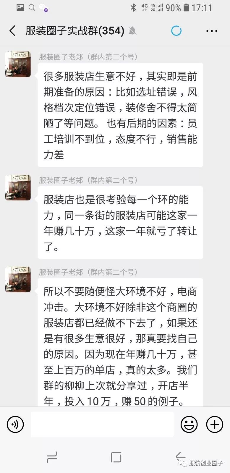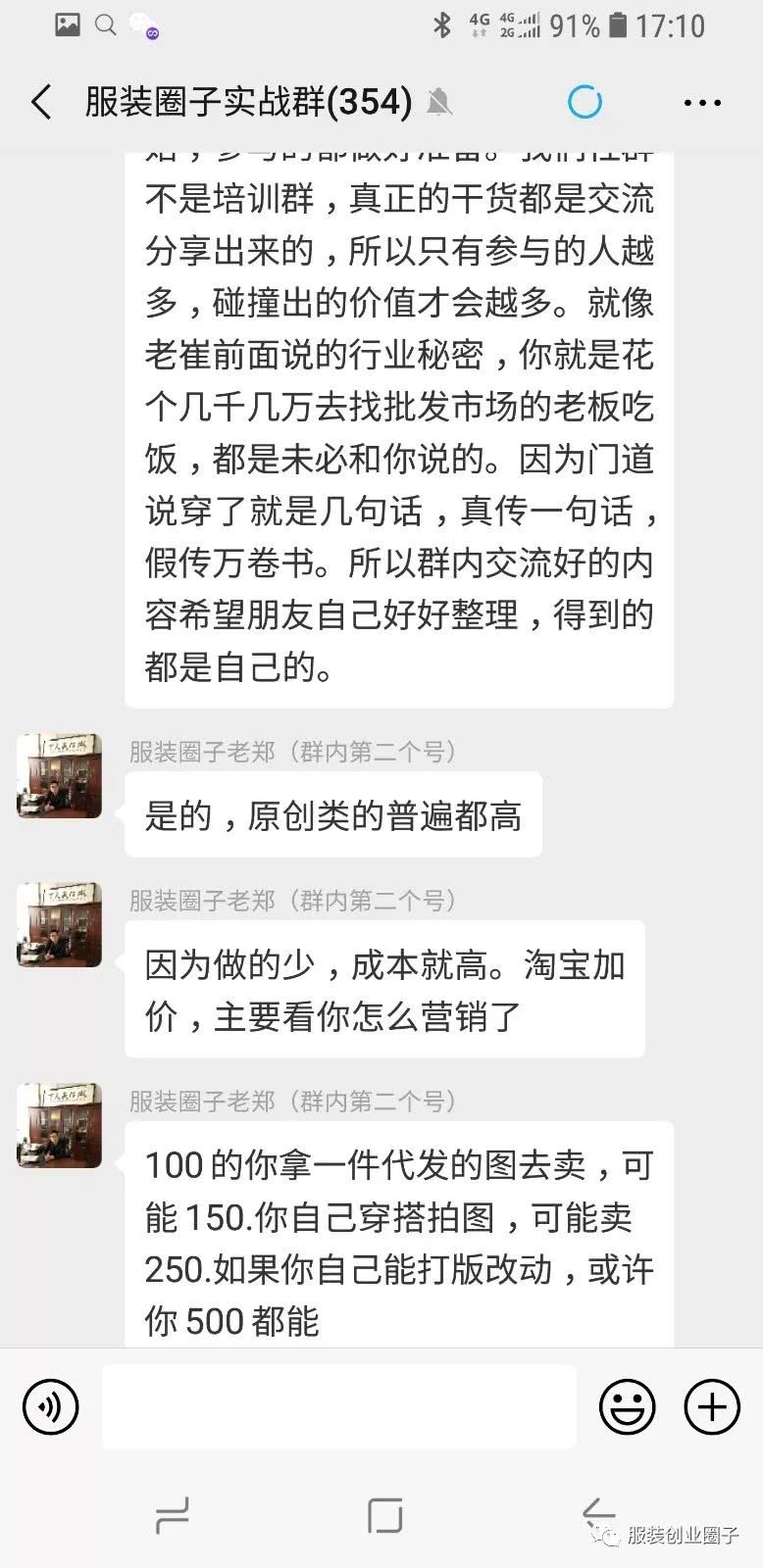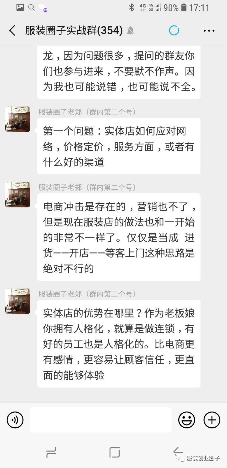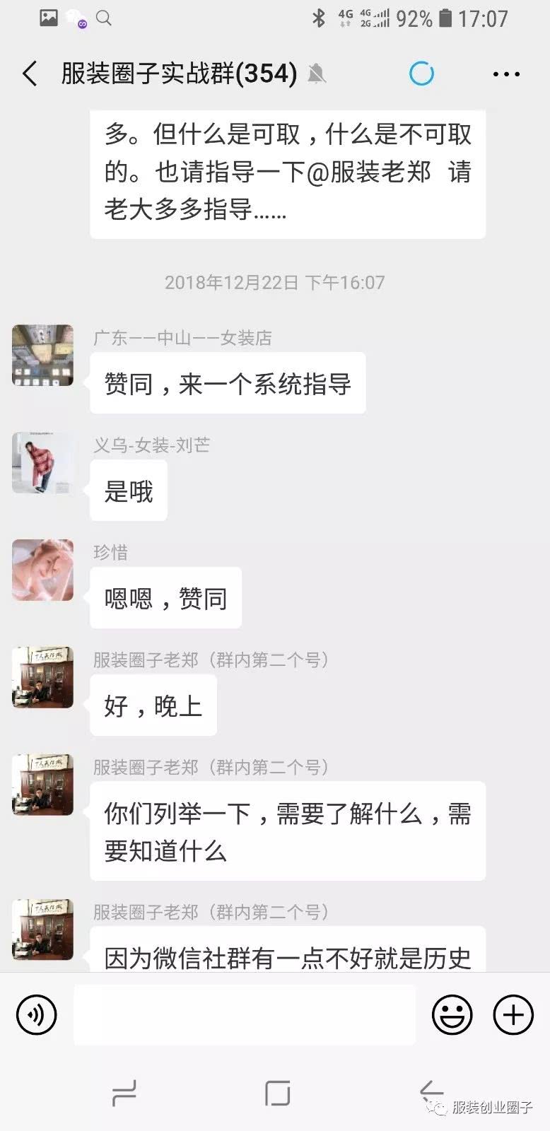 所以我做社群的初心就是希望能够提供更多有实际意义,有实操性的经验,干货和资源。如果你有任何实体店,工作室,品牌连锁,微商,淘宝,批发,工厂,社群,自媒体,短视频,货源,资源,经营,管理上的问题,都可以在社群内联系老郑。老郑从批发起家,到做工厂,和国内很多知名品牌有着生产经营合作。只有自己有实操的经历经验才能帮助群友。尽全力真正的帮助到每一位服装人去做好服装生意。我没有什么一夜暴富的技术能说,因为我也不会忽悠。想要做好生意必须是持续不断的积累和努力,到某一个点的时候就会爆发。我们社群有些成员做服装赚了几十万,几百万,几千万。没有一个是突然就有。持续的积累+机遇才会产生爆发。所以每一个人都应该充满信心,因为这个行业是容易带来无数个可能的。