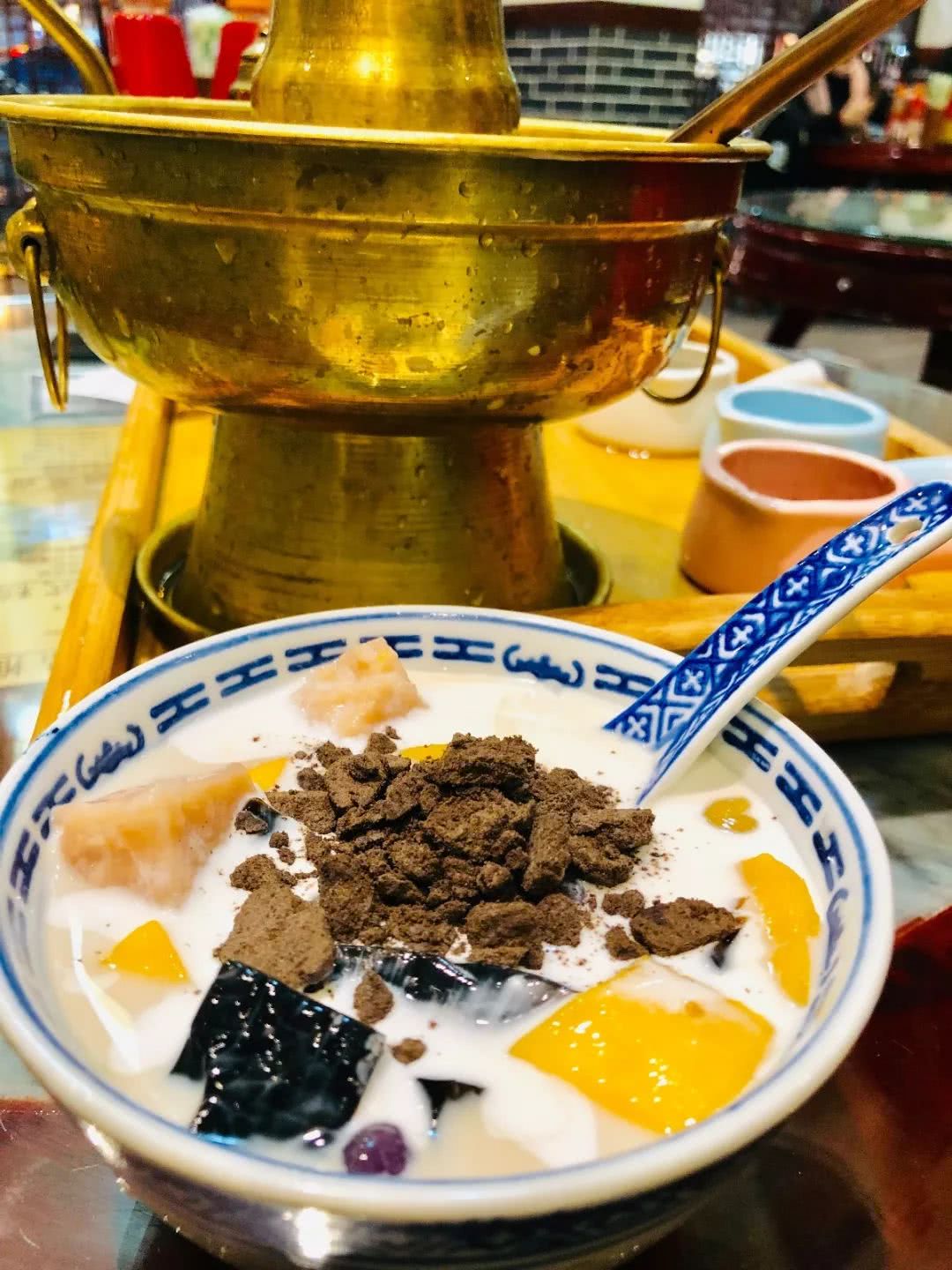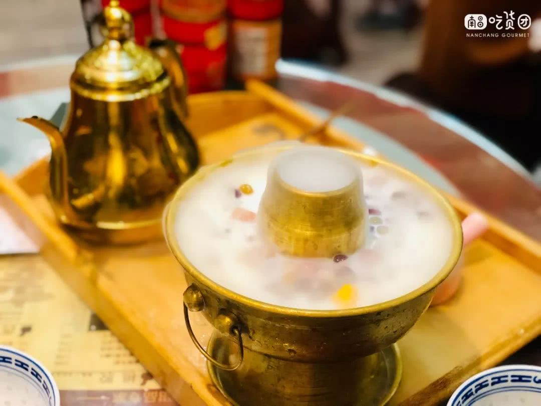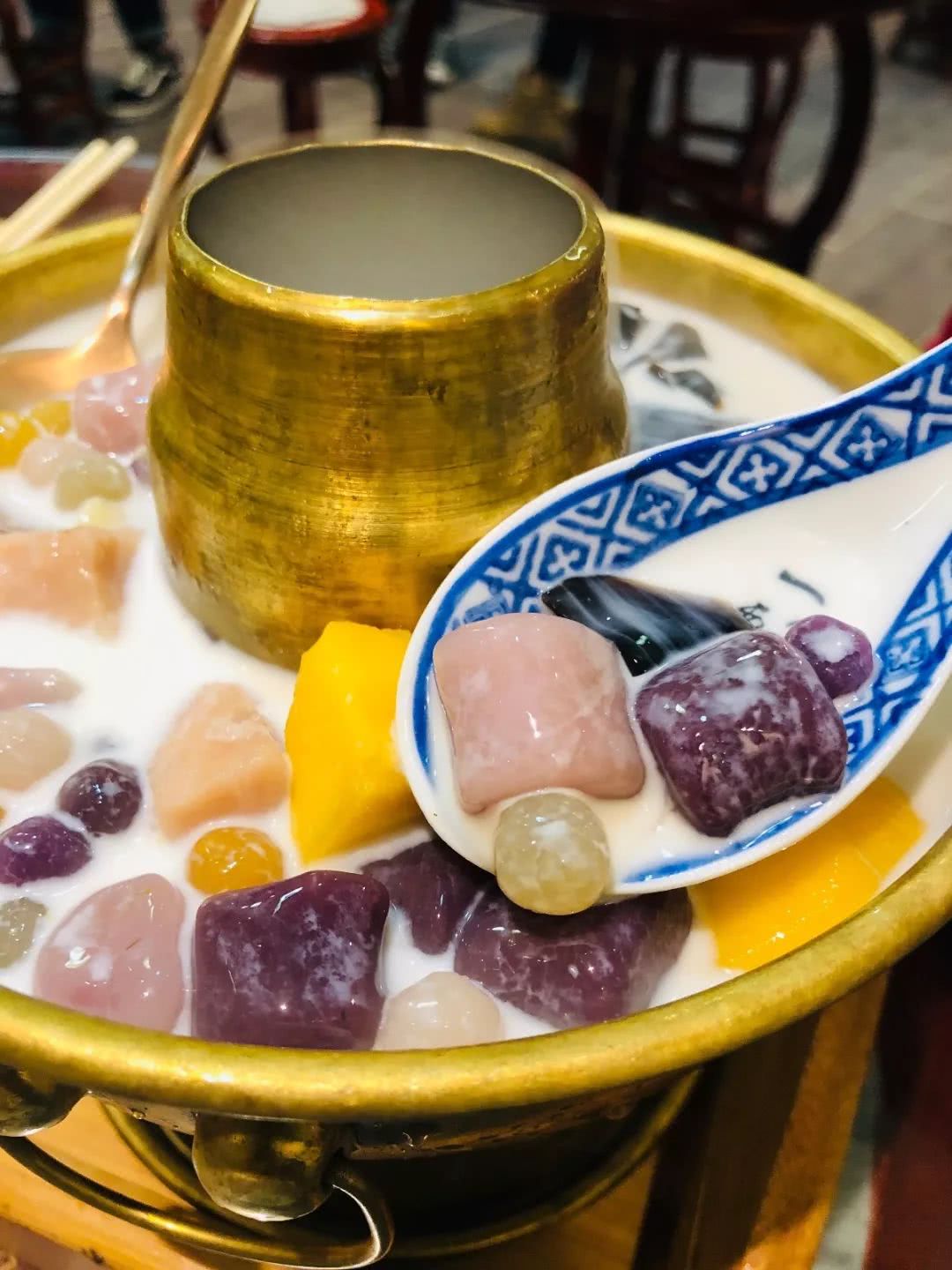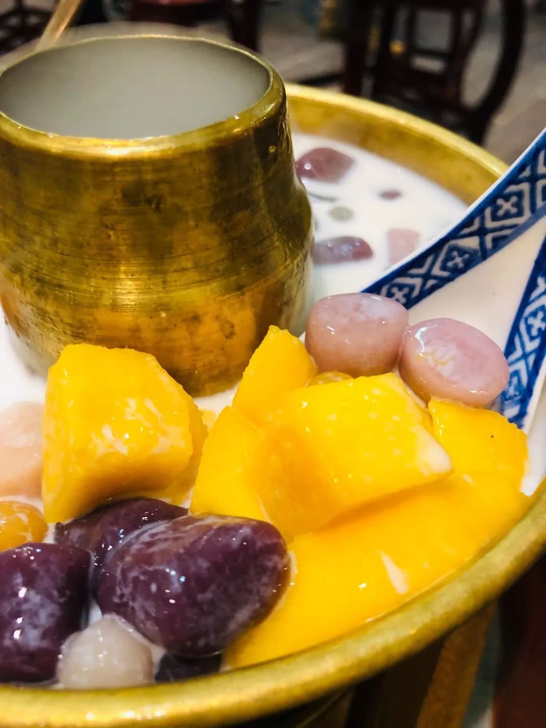 黄氏正轩是南昌第1家有芋圆火锅的店。出品自带仙气,金铜色的容器贵气十足。里面有芋圆、仙草、芒果、芋头、莲子等配料,然后倒入甜牛奶